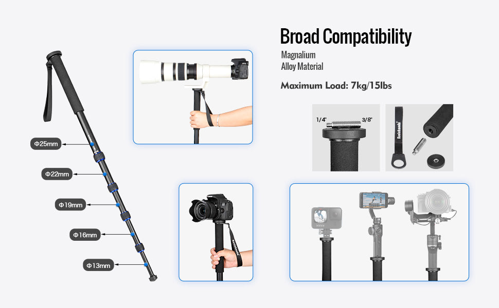 ★The monopod is made of high-quality aluminum alloy, which is strong and durable enough to keep the monopod stable.Maximum load: 7kg / 15lbs.