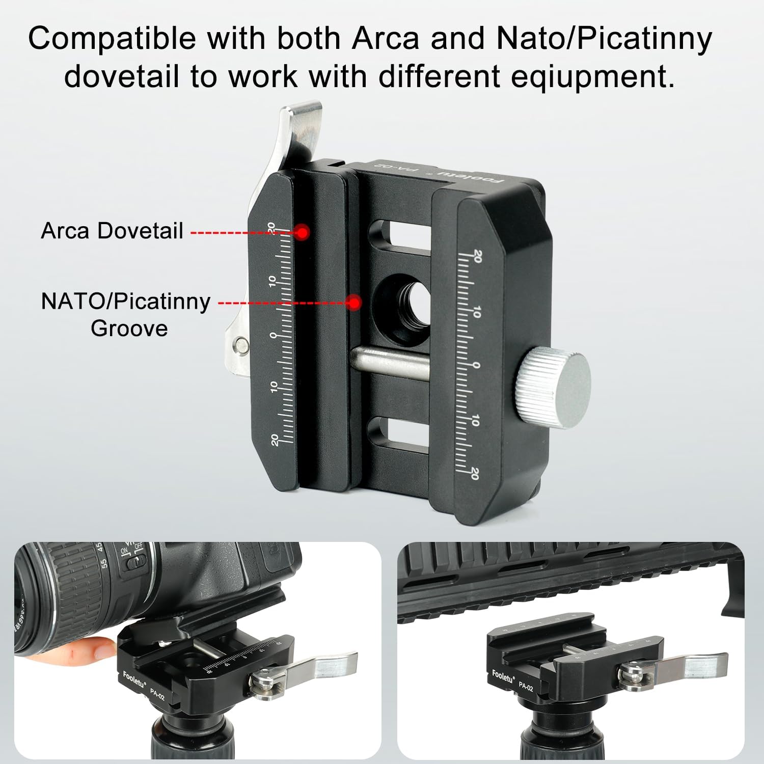 - 2-in-1 Arca-Swiss adapter, Supports both Arca Swiss plate and Picatinny mount systems for enhanced flexibility in your photography setup.