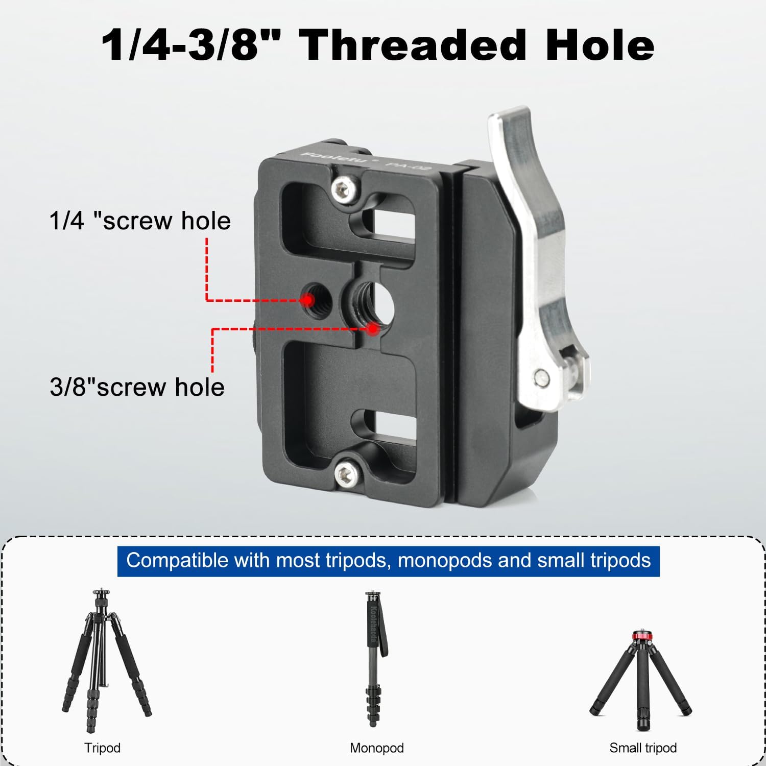 - The bottom 38mm width dovetail compatible with Arca Swiss quick release clamps and as well as various Arca tripod ball heads, and has 1/4" and 3/8" screw threads for direct mounting on your tripod or monopod.