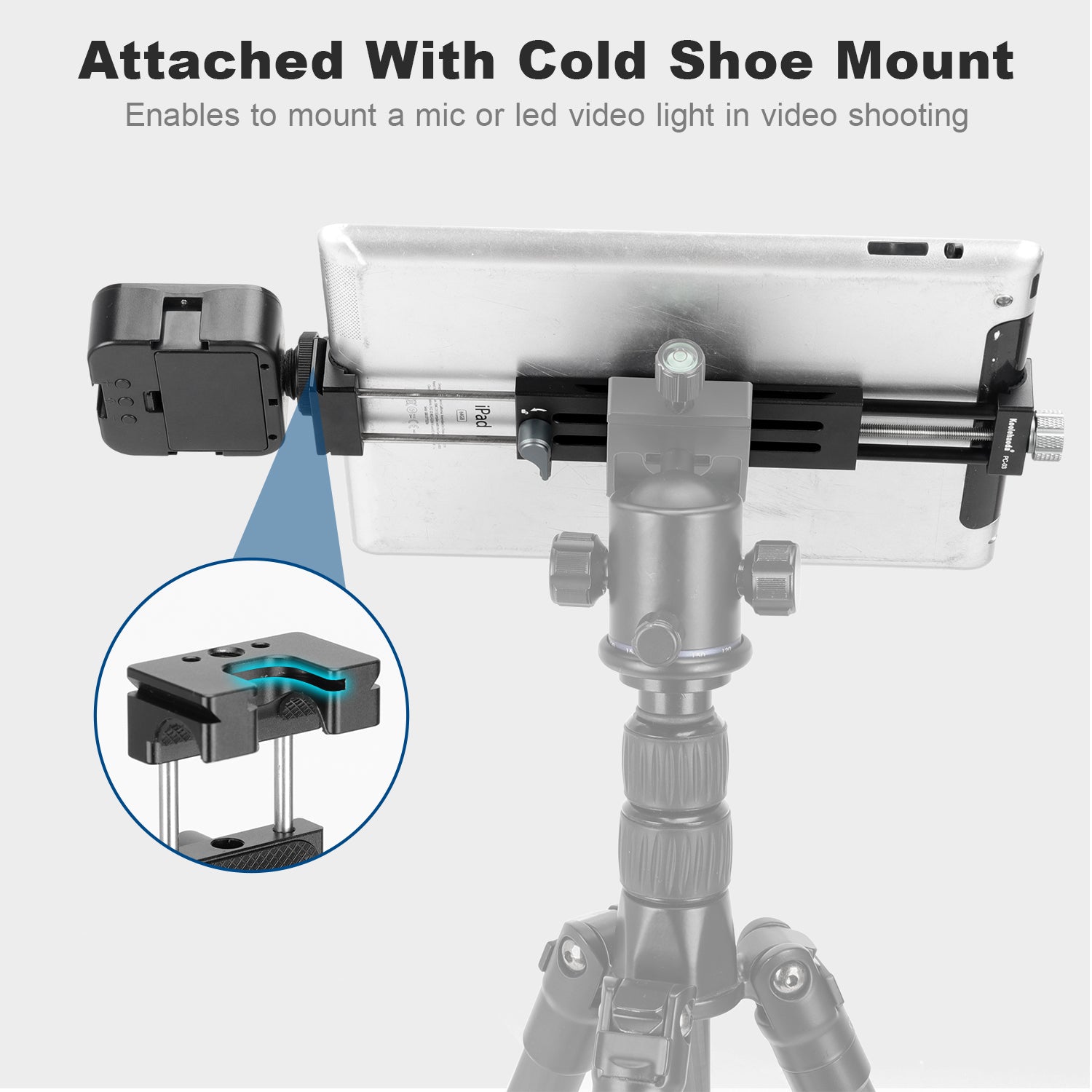 • 【Cold Shoe Mount】the PC-03 ipad holder attaches with a cold shoe on the bottom, enables you to mount a microphone or led video light for video recording, definitely improve video quality.