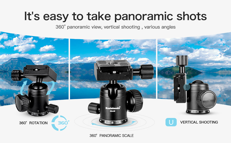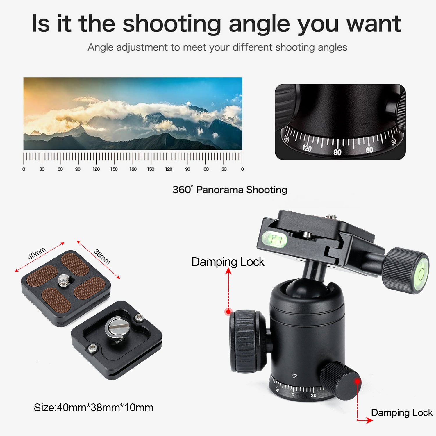 • :) 360 degree spin ball head with 1/4 "screw quick-release plate, suitable for all SLR cameras.Tripod with 3/8"screw, it can be connected with monopod or selfie stick for multi-purpose use.