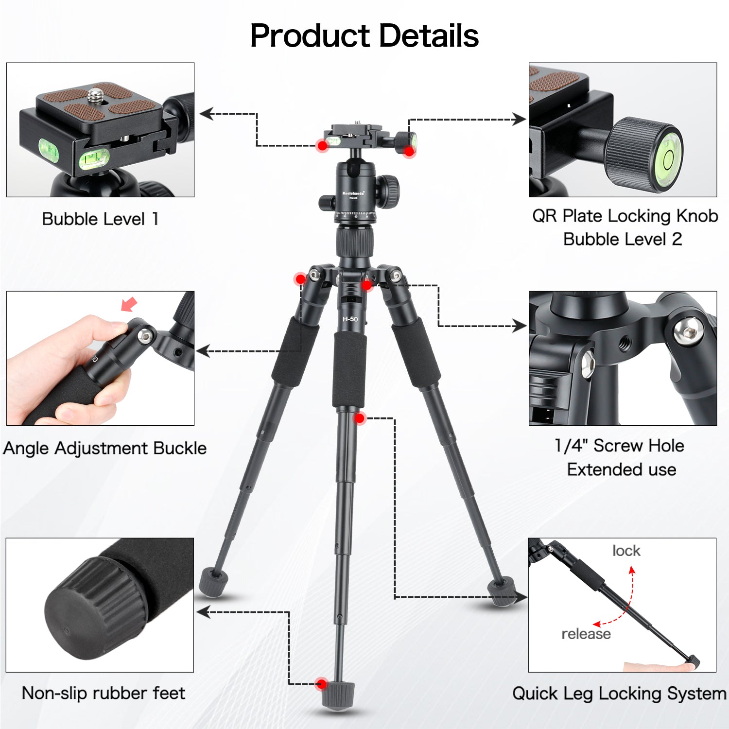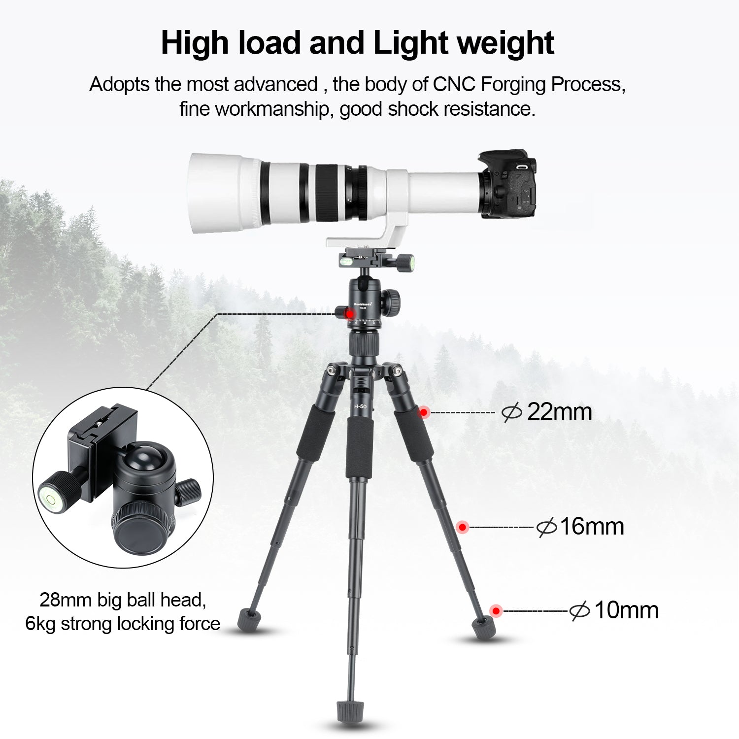 • :)The tripod is made of high strength aluminum alloy feet tube and quick leg lock design, advanced CNC processing technology. Strong and stable. Load up to 11lbs / 5kg.