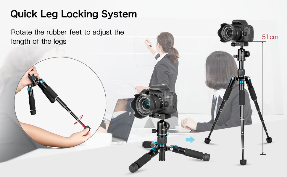 • :)The tripod is made of high strength aluminum alloy feet tube and quick leg lock design, advanced CNC processing technology. Strong and stable. Load up to 11lbs / 5kg.
