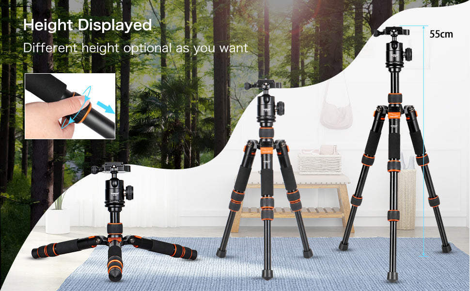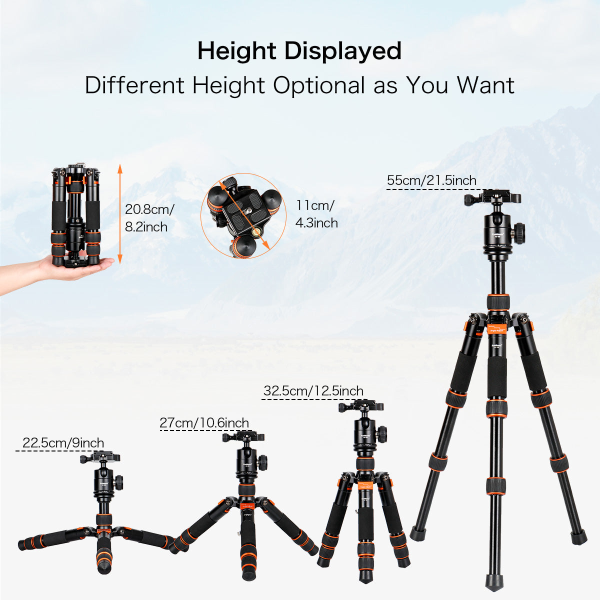 - Max height: 55cm / 21.5 inch (with tripod head)