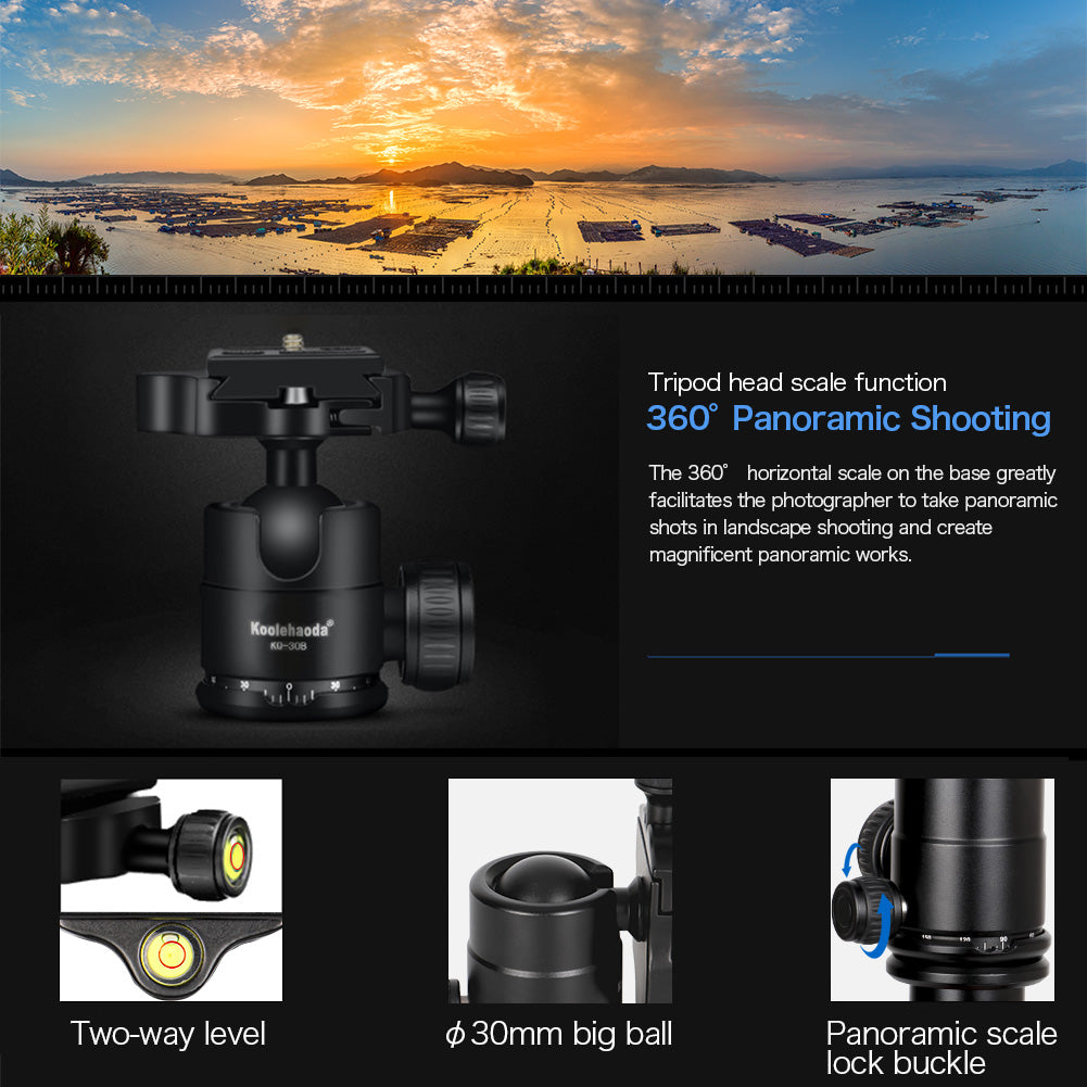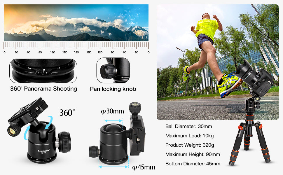 - ◆Panoramic View: With two independent control knobs, the specially designed ball-head can rotate 360°allowing you to get the perfect shot every time.