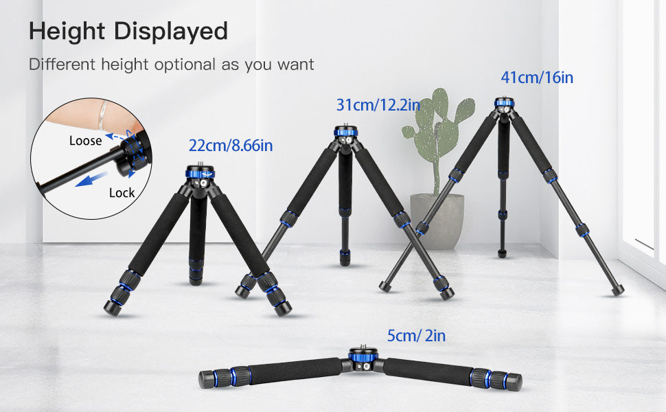 (1)Maximum height : 41cm / 16 inch(2)Least height: 5cm / 2 inch(3)Folded Length: 26cm / 10.2inch(4)Mini Tripod Top connection screws : 1/4 and 3/8 screw(5)Number of Leg Sections:3(6)Leg diameter: Φ19,Φ16,Φ13mm(7)maximum load:10kg/22lbs(8)Mini tripod net weight : 460g/1lbs(9)Package weight:510g /1.12lbs